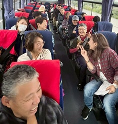 大山分会レク、バスの中も楽しくにぎやか |